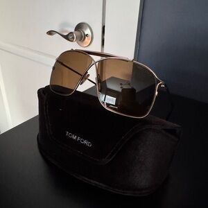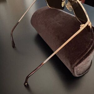 Tom Ford aviator-style sunglasses. Shiny gold metal frame. Warm brown tinted lenses. Sleek designer detailing on temples. Style is from 2012 collection. Includes case.
