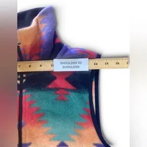 Features a vibrant multicolor Southwest pattern, full front zip, high mock neck for warmth, and soft fleece fabric perfect for layering in any season.
