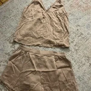 Experience ultimate comfort with this elegant satin sleepwear set. The tan color adds a touch of sophistication to your nighttime routine. Perfect for lounging or sleeping.