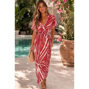 The Young, Fabulous & Broke Isla Maxi Dress in size L is a vibrant and stylish piece perfect for various occasions such as travel, parties, or casual outings. The tie-dye pattern adds a fun and trendy touch, while the bohemian theme gives it a unique and carefree vibe. With short sleeves, a V-neckline, and a long dress length, this lightweight rayon dress is ideal for warm summer days or spring adventures. Hand wash only to maintain its colorful and whimsical look.
