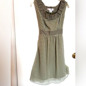 Charming Mac & Jac gingham dress in soft green and cream tones featuring a feminine gathered neckline and flattering ribbon tie waist detail.