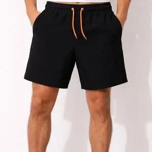 Comfortable black athletic shorts with a vivid orange drawstring for adjustable fit. Elastic waistband and side pockets for easy storage. Lightweight, breathable fabric ideal for training and everyday activity. Clean, modern silhouette in black with a bold orange accent.