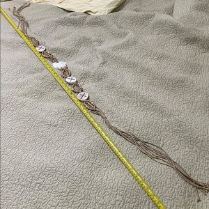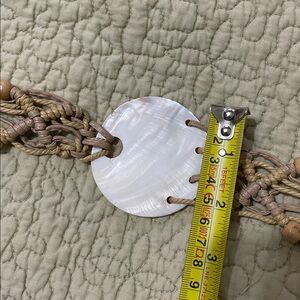 This could be a loose site product made to look like mother in Pearl. The macramé is a tan color with tan colored wood beads as well. 5 feet long. It’s a one size fit most ending in a tie fringe.