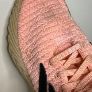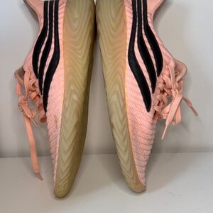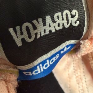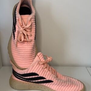 Adidas Sobakov sneakers in a bold clear orange/pink or salmon colorway. Clean streetwear/soccer-inspired silhouette with that signature wavy sole.