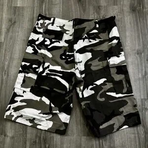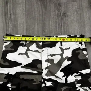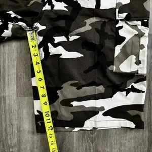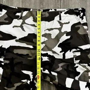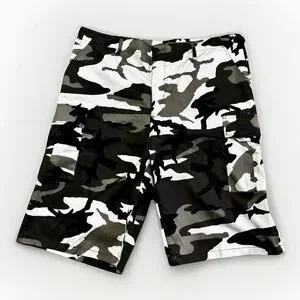 The Rothco BDU Black White Camo Long Shorts in Men's Size 39 to 43 are versatile cargo shorts perfect for casual occasions. Made from a durable canvas fabric with a camouflage pattern, these shorts feature an adjustable waist and cargo pockets for added functionality. The high rise and 12-inch inseam offer a comfortable fit, while the easy-care and machine washable material ensures low maintenance. With accents like buttons and a flat front design, these shorts combine practicality with a stylish Army-inspired theme suitable for various seasons.