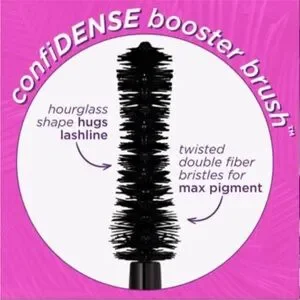 Mascara brush wand shown with dense twisted double fiber bristles. Hourglass shape designed to hug lashline. Deep black brush for intense pigment.
