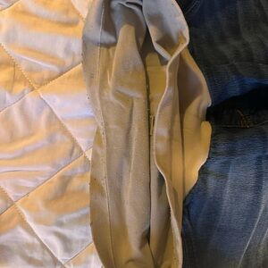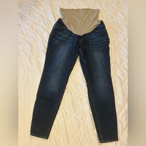 Slim-fit dark wash skinny jeans with a supportive beige maternity panel. Subtle fading and gentle whiskering at the hips. Stretch denim for easy movement and a streamlined silhouette. Notice some pilling in the panel.