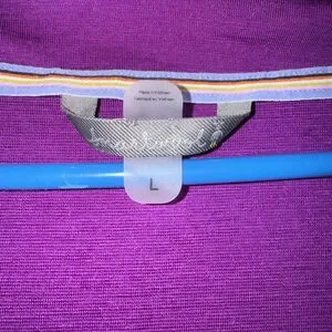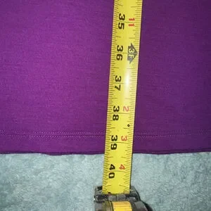 This is a women's Smartwool long-sleeve wrap dress in a solid purple color, size L. The dress features a V-neckline and a gathered waistline. It is made from a blend of 94% Merino wool and 6% Elastane, as indicated by the care tag. The dress measures approximately 39 inches in length and about 15 inches across the waist when laid flat. A loose thread is visible near the both side of the waist seam. Check the photos for measurements