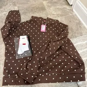 NWT Edikted Brown hoodie with cream Polka Dots Large