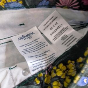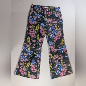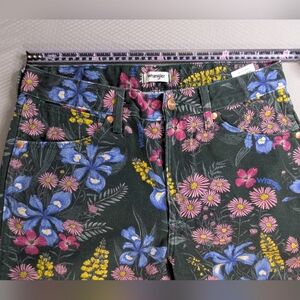 Stylish Wrangler jeans with a vibrant floral pattern. Features a flare and wide leg design. Perfect for a bold look.