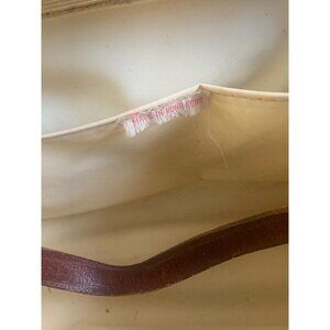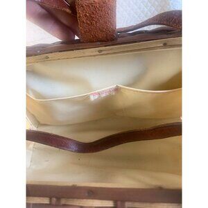 Leather straps show minor wear; interior slightly stained but intact. Measurements: 11 inches long, 6 inches tall, 3 inches wide.