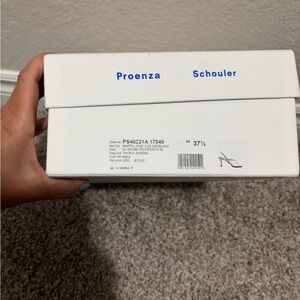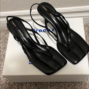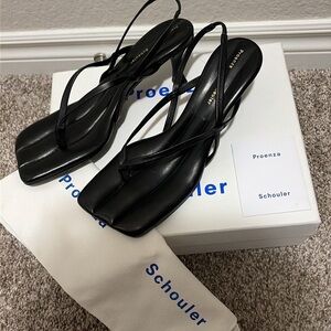 Sleek black leather strappy sandals by Proenza Schouler. Smooth leather upper with minimalist thong straps for a modern look. Cushioned square toe for comfortable all-day wear. Elegant design that pairs with both casual and dressy outfits.