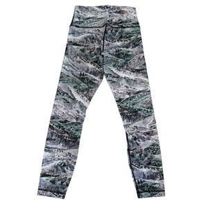 Comfortable high-waist leggings with a green multicolor abstract print. Soft, stretch fabric for movement and all-day wear. Flatlock seams and a supportive fit for workouts or casual wear. Stylish green-print design complements a variety of tops.