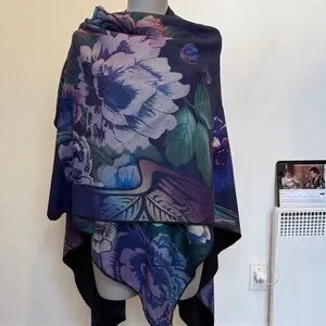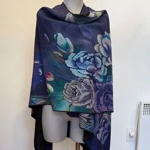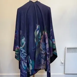 Soft cape featuring a rich floral print in deep purple, blue and multicolor tones.
