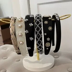 Set of decorative women’s headbands featuring pearl and crystal accents. Includes black headbands with pearl and crystal embellishments, a cream studded headband, and an ivory pearl-accented band. Elegant, versatile pieces that add instant polish to any look. Lightweight and comfortable for all-day wear.