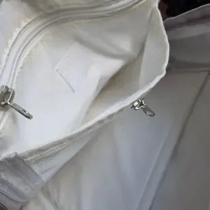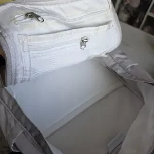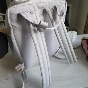 Doughnut pastel backpack in cream, light gray, and pink. Front pocket features embroidered cat and brand label. Many internal pockets with water bottle pouches and 14 inch laptop sleeve. Size: 14.9"(H) x 11"(W) x 4.7”(D) with 16L capacity.