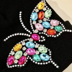 This soft black knit hat features a stunning multicolor rhinestone butterfly design with vibrant gems and crystal detailing. The sparkle catches the light beautifully—perfect for elevating any casual or winter outfit.