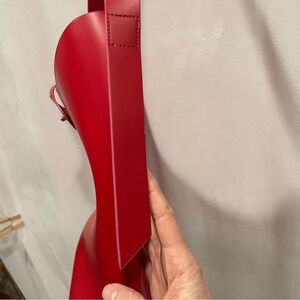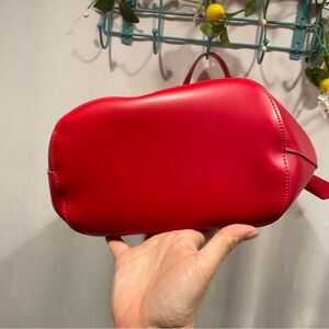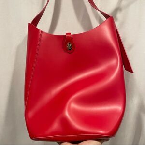 Adorable red bucket bag from Elizabeth Arden. Looks super expensive. Made from pvc. Single toggle closure. Measurements are approximately 12” x 12” and 6” deep. Strap drop in 10”
