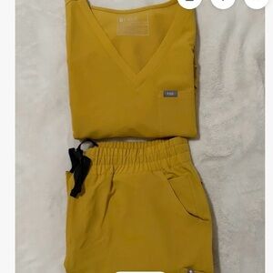 Chic mustard scrubs by Figs. Features V-neck top and drawstring pants.
