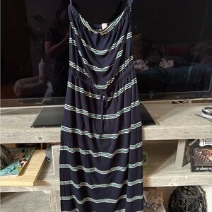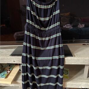 J. Crew strapless maxi dress in navy with white and teal horizontal stripes. Elasticized waist with tie. Lightweight, casual knit ideal for warm days.