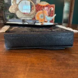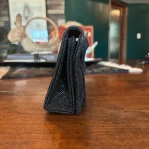 Chic black evening clutch with a decorative bow detail. Sparkling fabric adds a fun subtle shimmer. Lightweight and easy to carry for parties and formal occasions. Classic black design complements a wide range of outfits.