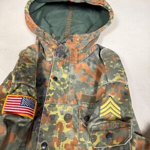 Vintage 1994 German Flecktarn Camo Parka by H. Winnen GMBH & CO. KG features a durable cotton-polyester blend construction with a full-zip and snap-button front closure. This military-issue field jacket includes a fixed hood, adjustable drawstring waist for a tailored fit, and multiple utility pockets. Distinctive additions include a US flag patch on the right shoulder and sergeant rank insignia on the left, blending European surplus style with American military accents.