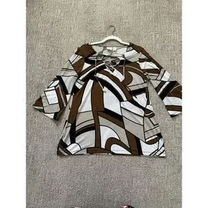 Chico’s Size 1 Abstract Print Lace-Up Brown Black Cream 3/4 Sleeve Stretch Top