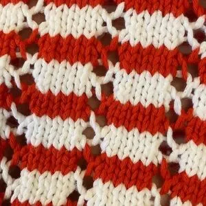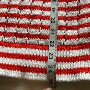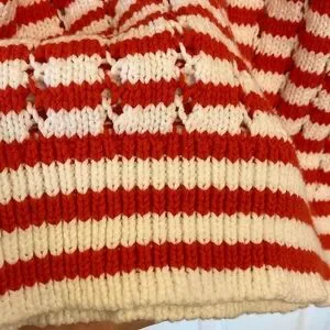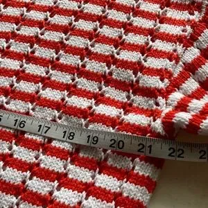 Lightweight knit with a relaxed boat neckline. Red and white checker-stripe pattern across body and sleeves. Ribbed neckline, hem, and cuffs. Easy, casual layering piece.