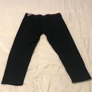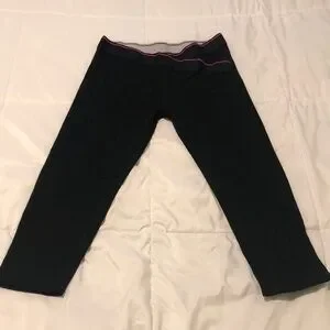 Black Capri leggings with a hot pink stripe that goes around the triangular elastic band as shown on top. Only worn a few times. Great for working out or everyday wear