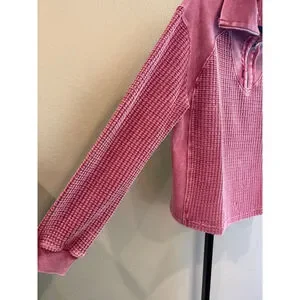 Easel Women's Thermal Waffle Knit Zip-Up Washed Long Sleeve Top Mulberry Size S