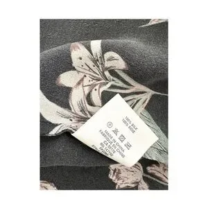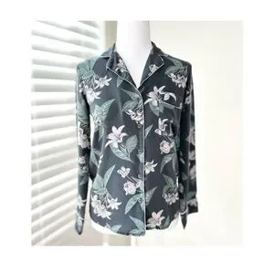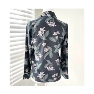 Button-front top with delicate allover floral print. Charcoal base with soft sage leaves and pale cream blossoms. Lightweight, relaxed fit ideal for everyday wear. Silk.