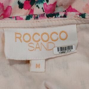 This Rococo Sand Mimi wrap dress features a soft pink watercolor print with romantic ruffle details for an effortlessly feminine look. The V-neck and long sleeves create a flattering silhouette perfect for day-to-evening wear.