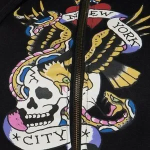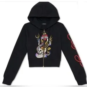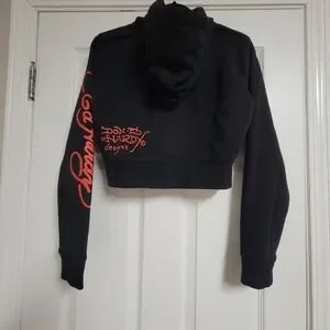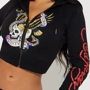 Ed Hardy Black New York City Nyc Skull Cropped Hoodie Size Large.