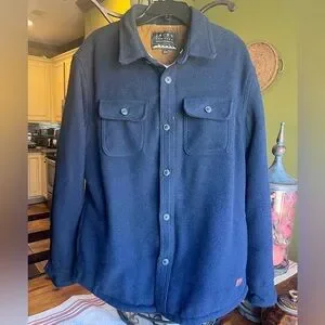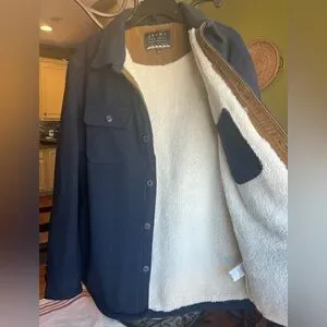 Classic shirt-jacket silhouette with button-front closure. Two flap chest and two side seam pockets for easy storage. Soft textured fabric and warm Sherpa lined for comfortable layering. Clean, versatile navy shade pairs with many outfits. Heavy weight jacket