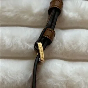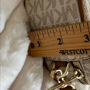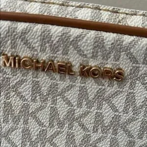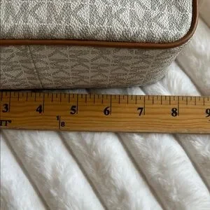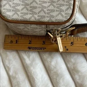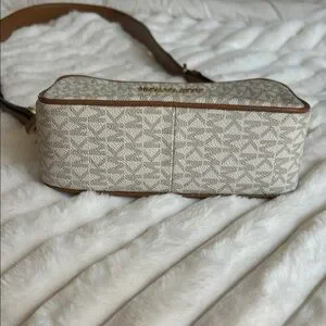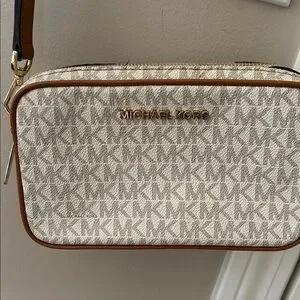Stylish Michael Kors crossbody with signature monogram. Cream and tan tones. Perfect for everyday elegance.