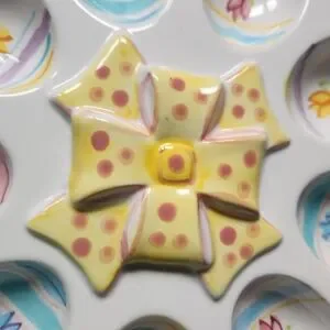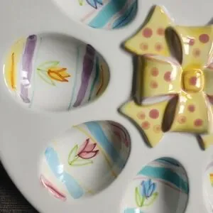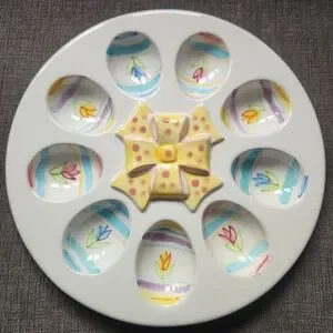 This colorful ceramic deviled egg serving dish holds nine eggs and features of vibrant dimensional bow in the center and painted tulips in each egg indentation.