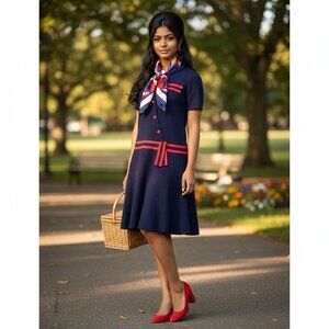 This Elle Couture Ltd dress features a vintage nautical design with Trevira fabric, including 30% new wool. Short sleeves, red accents, and a belted detail at the waist emphasize its polished and timeless silhouette. Includes unique button-front closure and pocket embellishments for style and practicality.
