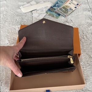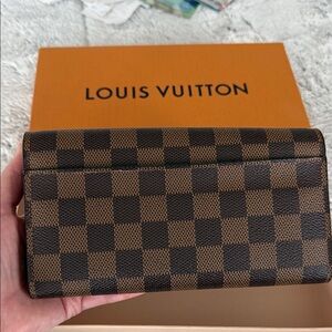 Louis Vuitton continental wallet in Damier Ebene canvas. Checkered dark brown exterior with envelope flap and gold-tone snap. Sleek silhouette with classic LV embossed detailing. Timeless piece for organized everyday use.