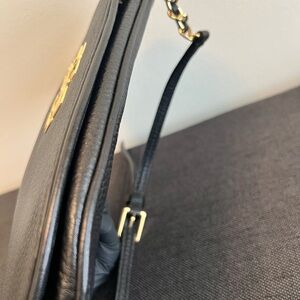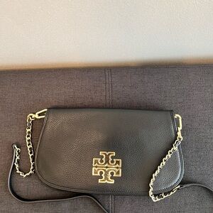 Chic black crossbody bag by Tory Burch. Features gold chain accents and iconic logo. Perfect for versatile styling. Can be used as a clutch by removing detachable leather and gold shoulder strap. Dust bag included.