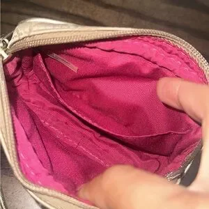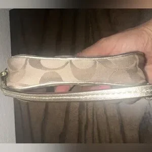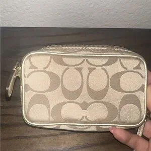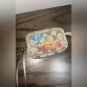 Compact Coach wristlet in signature tan canvas. Gold-tone trim and wrist strap. Bright blue, yellow, and pink graphic accents on front. Secure zip closure and handy size for essentials.
