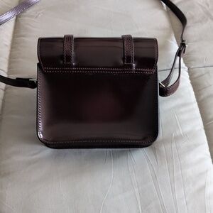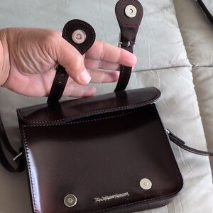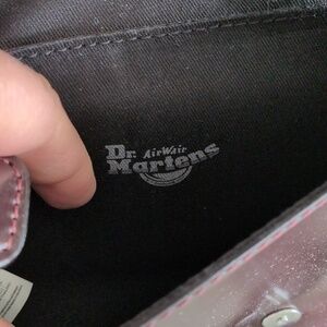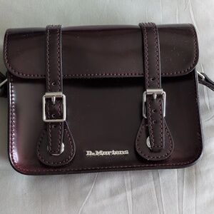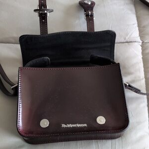 Small faux brown leather shoulder from Doc Martens with front snaps for closure. The strap is adjustable. There is room for a phone and any other necessities. (6.75Wx 5.75Hx 1.75D)