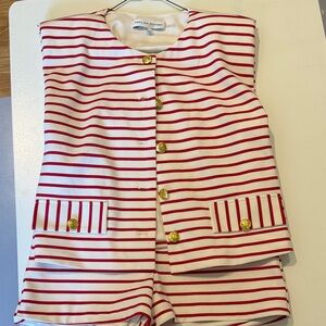Sleeveless striped jacket in red and white and matching shorts. Features gold-tone decorative buttons down the front and on pockets. Clean, polished nautical-inspired design. Easy to style for layered looks.