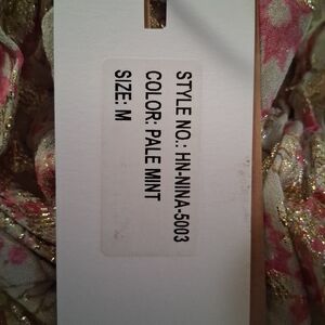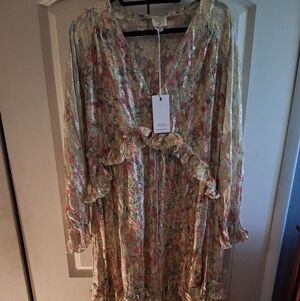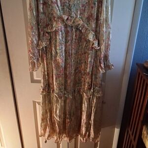Elegant long-sleeve maxi dress by HEMANT & NANDITA. Soft cream base with delicate floral print. Subtle pink and green accents throughout. V-neckline and tiered skirt. Side slit for a graceful silhouette.