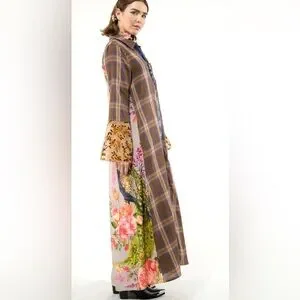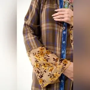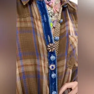 • Plaid duster with contrast floral/peacock print back, lower part of the sleeves with floral burnout velvet, front & side pockets, velvet CF placket, 2 decorative crystal buttons attached to CF placket