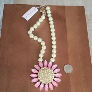 Pearl-style beaded strand. Large pink crystal sunflower pendant with gold-tone rhinestone center. Charming and eye-catching accessory. Feminine and bold accent piece.