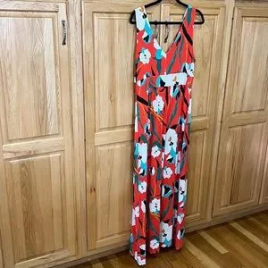 Sleeveless maxi dress with a deep V-neck. Orange base with large white and teal floral print. Fitted waist for a flattering silhouette. Lightweight, flowing skirt for easy movement. Bold, summery look for warm-weather occasions.