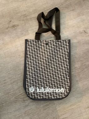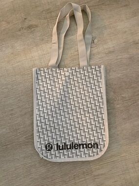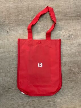 Set of Lululemon reusable bags and pouches. Includes black tote with logo, red small tote, and two gray patterned pouches. Durable, lightweight, and versatile for everyday use.