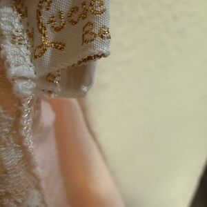 Made in the USA from soft peach nylon chiffon, it features a sheer lace bodice with satin butterfly appliqués, a delicate empire waist with satin ribbon tie, and a full, flowing floor-length skirt that moves like candlelight. The color flatters every complexion, while the craftsmanship—Beverly Hills at its finest—makes this piece truly collectible.