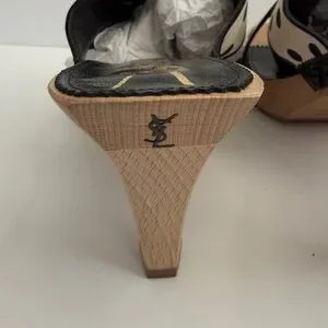 NWT - Stylish vintage YSL heeled slides in ivory and black polka dot fabric with black trim and a criss-crossed toe strap. Open toe with wooden heel and base. Features a YSL logo on heel and branded YSL insole detail. Includes YSL shoe bag and original box.