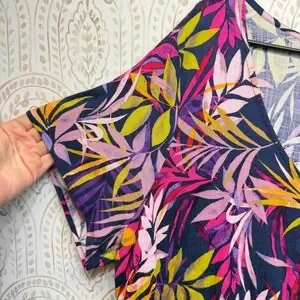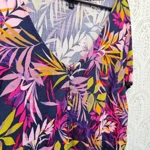Short sleeve babydoll top features a vibrant tropical palm leaf print in shades of pink, purple, orange, and green over a navy blue ground. Designed with a flattering V-neckline and a partial button-front placket, this tiered blouse offers a relaxed, flowy silhouette. The lightweight rayon-blend fabric provides a soft feel with a hint of stretch for comfort.
